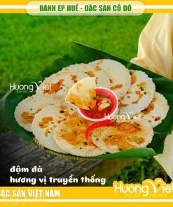 Chiếc bánh ép Huế khô tròn vành vạnh, mỏng tang. Nhìn thấu được cả những con tép đỏ au và màu xanh thơm của hành lá. Cầm miếng bánh trên tay đã thấy được cái độ giòn của nó. Đưa lên miệng cắn một miếng, âm thanh “rôm rốp” vang lên nghe thiệt đã tai.