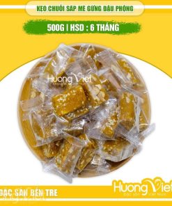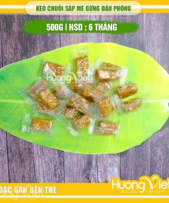 Về Bến Tre, đừng chỉ mải mê với kẹo dừa nhé! Có một thức quà quê khác dân dã hơn, đảm bảo sẽ khiến bạn thương nhớ – đó là kẹo chuối. Và nếu bạn muốn nếm thử một phiên bản ‘nâng cấp’ đầy thú vị. Hãy tìm đến Kẹo chuối sáp dẻo mè gừng đậu phộng túi 500g. Đây không chỉ là một viên kẹo, mà là cả hương vị của vùng đất cù lao trù phú, là cái tình người dân dã được gói lại thật gọn gàng, thật ấm áp.